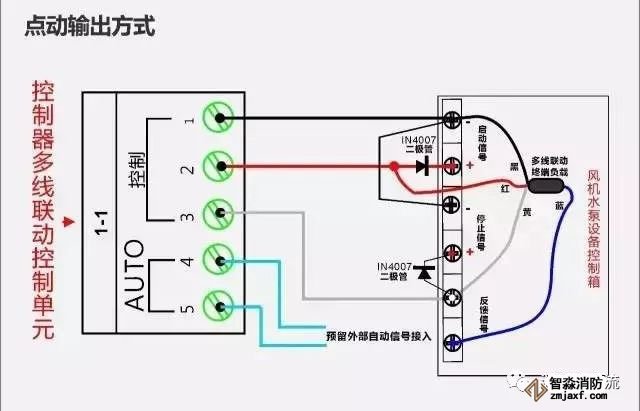 每个多线控制单元有三条线与终端设备(消防风机、水泵等)的控制箱连接,一条启动、一条停止、一条反馈。