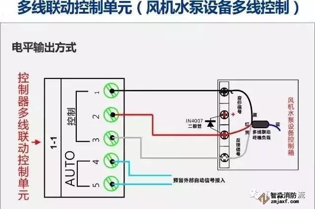 以下为国内某品牌消防报警设备的多线控制接线图,分为电平输出和电动输出两种方式。