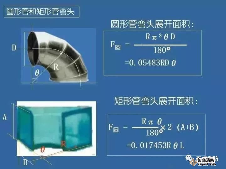 在风管工程量计算中:各种材质、各种形状的风管均以施工图示的不同规格以展开面积(㎡)计算,不扣除检查孔、测定孔、送风口、吸风口等所占面积。风管长度一律与施工图示中线线长度为准,包括弯头、三通、变径管、天圆地方等管件的长度,但不得包括部件的长度。直径和周长按图示尺寸为准展开,咬扣重叠部分已包括在定额内,不得另行计算。