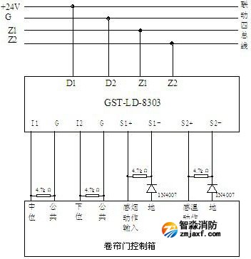 图13 GST-LD-8303模块与防火卷帘门电气控制箱(标准型)接线示意图
