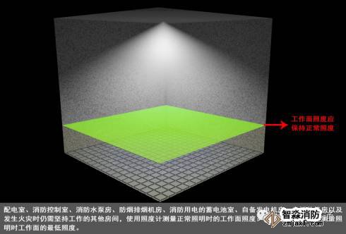 使用照度计测量应急照明灯地面中心最低照度不应低于0.5Lx,地下人防工程的照度不应低于5Lx,使用照度计测量消防控制室、消防水泵房、防烟排烟机房、消防用电的蓄电池室、自备发电机房、电话总机房等火灾发生时仍需坚持工作的房间正常照明时工作面的照度和应急照明时工作面的照度,图2-2、图2-3。