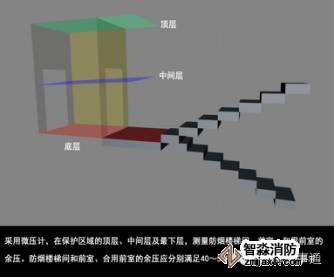 防烟楼梯间的余压值应为40~50Pa,前室、合用前室的余压值应为25~30Pa。