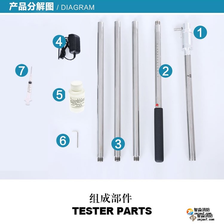 将枪头、连接杆、电池杆相应顺次连接,调整好加烟方向,按动启动开关,指示灯亮,枪内风机工作,烟雾从喷头出口喷入被试验的火灾探测器感烟迷宫,进行加烟试验。